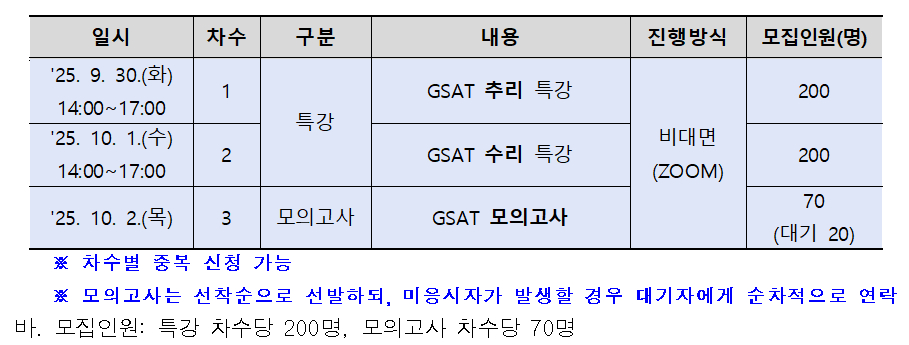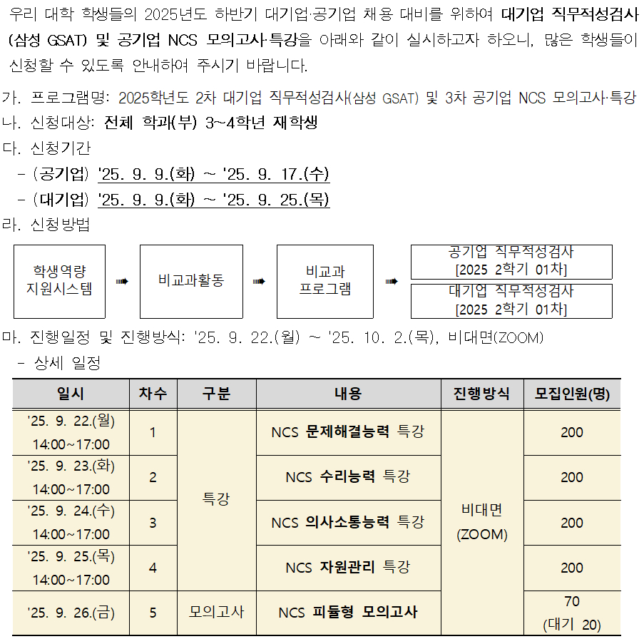 fnctId=bbs,fnctNo=4324 작성일 2025.09.09 수정일 2025.09.09 작성자 생명환경화학 조회수 75 [국립대육성]2025학년도 2차 대기업 직무적성검사(삼성 GSAT) 및 3차 공기업 NCS 모의고사 특강 안내 첨부파일 2025학년도 2차 대기업 직무적성검사(삼성 GSAT) 및 3차 공기업 NCS 모의고사·특강 실시 안내문.hwp 미리보기